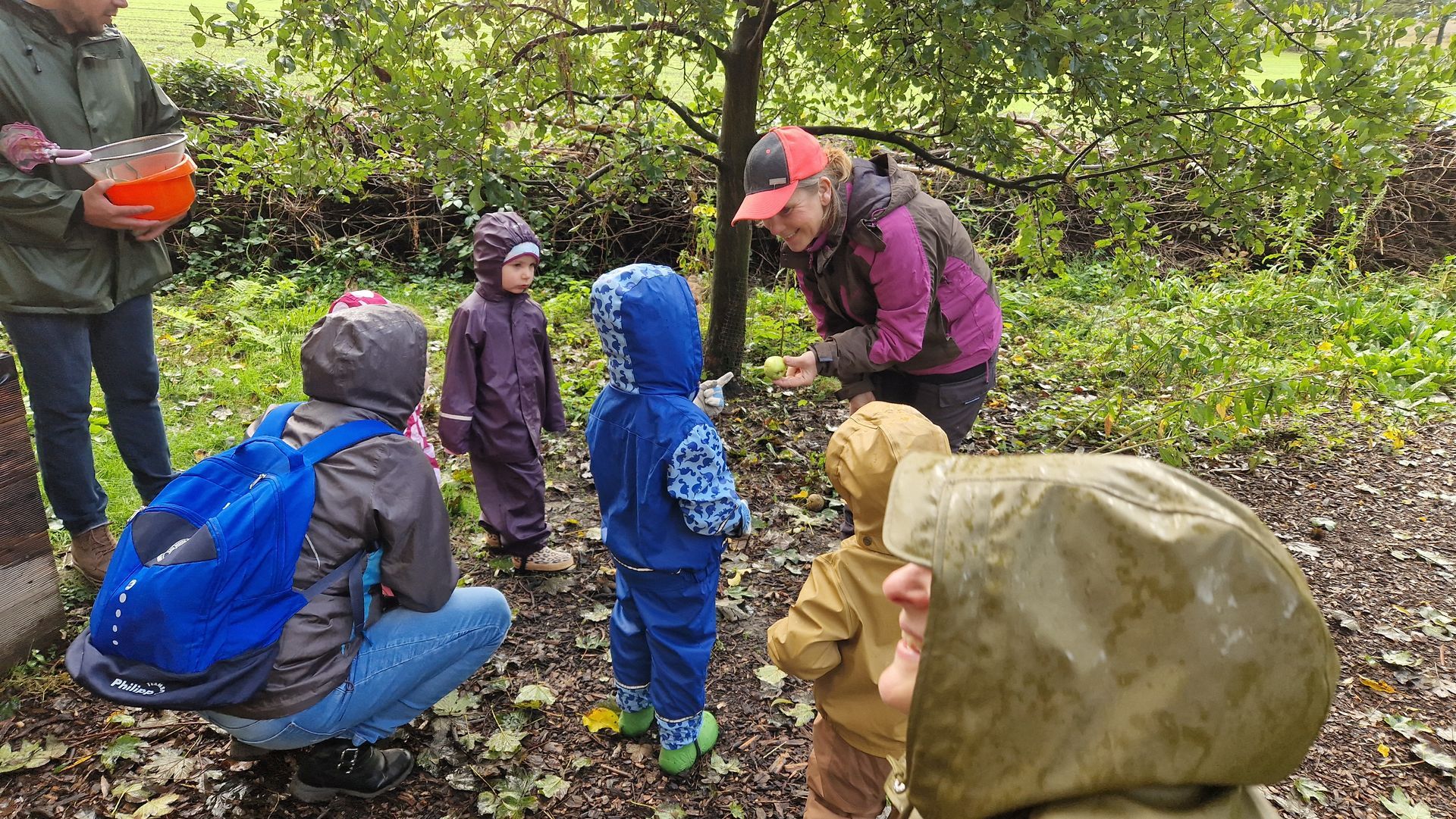 Die Kinder teilten sich in zwei Gruppen auf. Die älteren Kinder machten sich daran, Holz in unterschiedlichen Größen aus einem großen Stapel Feuerholz auszuwählen. Ihre Mission: eine Schubkarre mit Holz für die Eltern bereitzustellen, die sich um das Grillfeuer kümmern sollten. Anja und Uwe, vom Naturerlebnisgarten, begleiteten die Kinder und erzählten ihnen viel Wissenswertes über die Pflanzen und Bäume in der Umgebung. In beiden Gruppen sammelten die Kinder Kräuter und Blumen, die sie später für die Zubereitung von Kräuterbutter und Pesto verwenden wollten. Auf dem Weg durch den Garten konnten sie bereits einige Dinge probieren, darunter Kräuter, Äpfel und sogar Blumen. Die Neugier der Kinder kannte keine Grenzen.